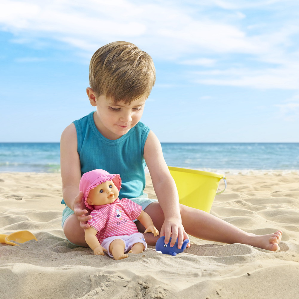 Denne lille dukke er en rigtig svømmer og en svømmekammerat, der hjælper børn med blidt at lære alle typer vandmiljøer at kende. Såsom i badet (sæbevand), i poolen (klorvand) eller i havet (saltvand).