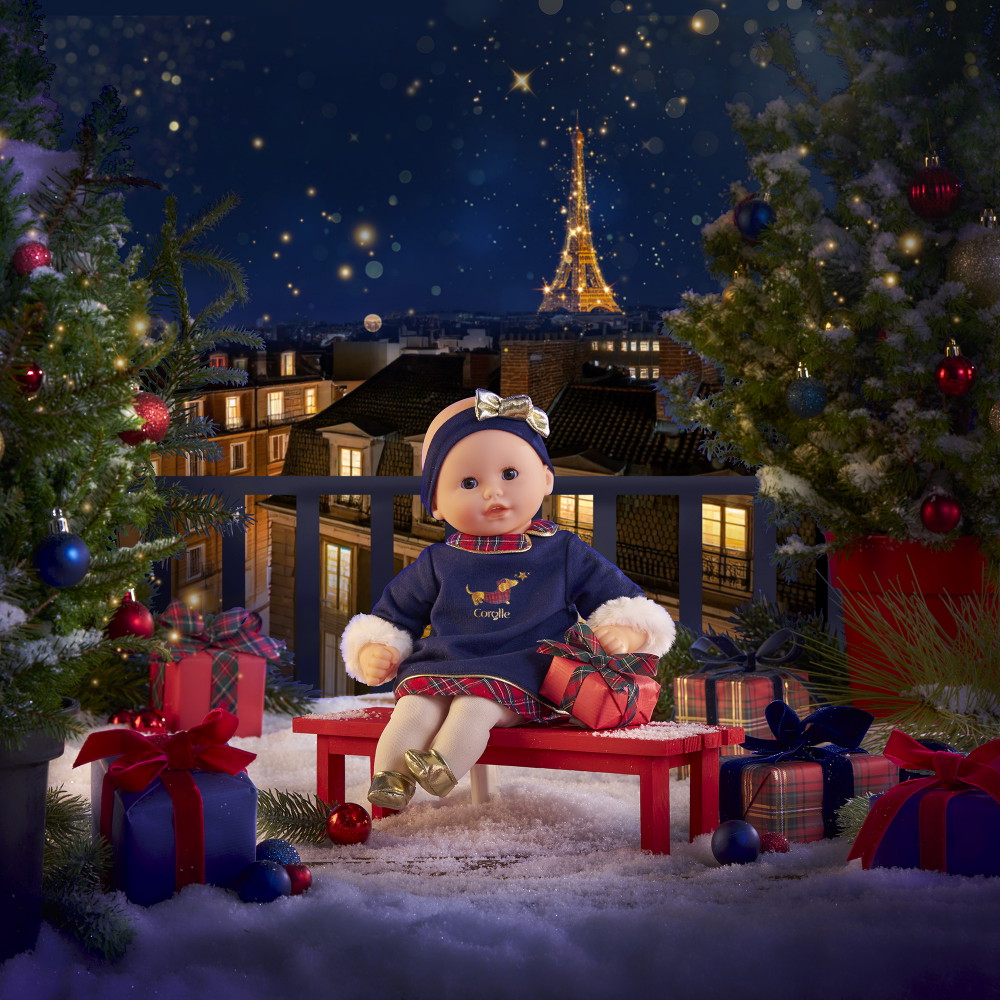 Denne dukke er klædt på til højtiden i en smuk marineblå langærmet kjole prydet med bløde hvide kunstpelsmanchetter. Ternede mønstre dekorerer Peter Pan-kraven og kanten af kjolen, mens nogle gulddetaljer lyser looket op. Et glitrende serigrafi af en lille gravhund i en ternet frakke tilføjer et sødt touch. For at fuldende sit outfit bærer Bébé Calin Margaux Corolle en Fêtes et cremefarvet strømpebuksesæt og guldfarvede ballerinasko. Hendes hår er toppet med et matchende pandebånd med en elegant guldsløjfe.