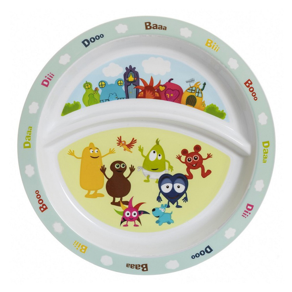 Gør måltidet sjovere med et farverigt motiv af alle Babblarna og deres huse.
