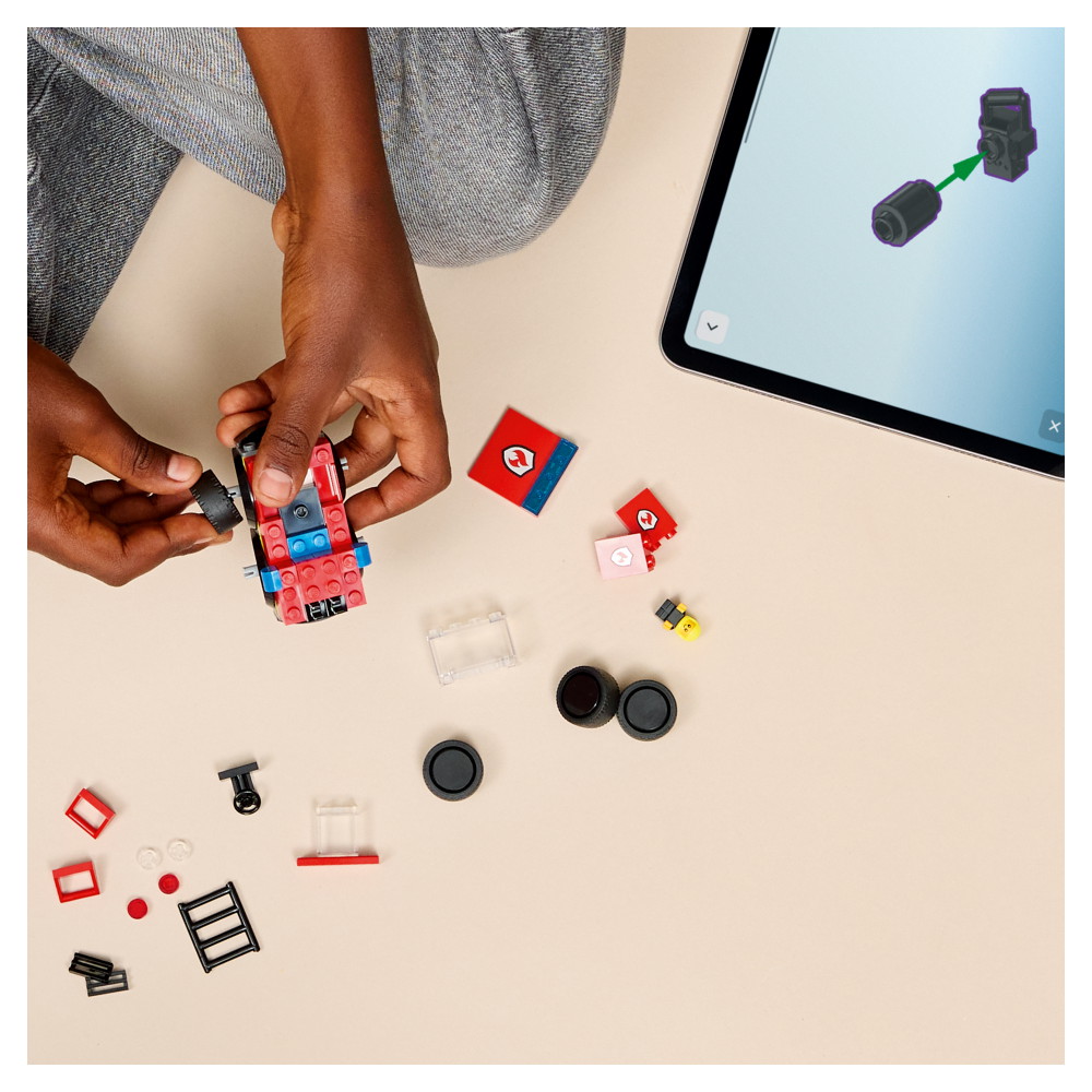 Børn kan nemt bygge LEGO City legetøjssættet Motorer – Brandbil med LEGO Builder appen, hvor de kan zoome ind på og dreje modeller med 3D-vejledning, gemme sæt og følge deres fremskridt. Byg-selv-sættet indeholder 67 elementer.