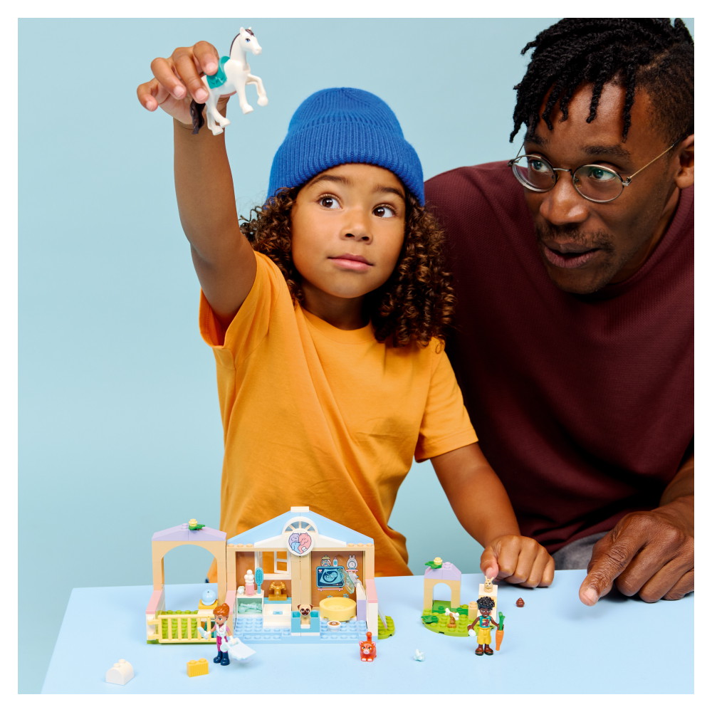 Byggesættet indeholder minidukker af Leo og Valeria samt figurer af hest, hund, kanin og 2 katte. Tilbehør som sprøjte, termometer, clipboard og kuglepen inspirerer til fantasileg med dyrlæge-tema. Hesten har en sadel, hø, striglebørste, gulerod, vand, hestepærer og en hjelm til en rytter.