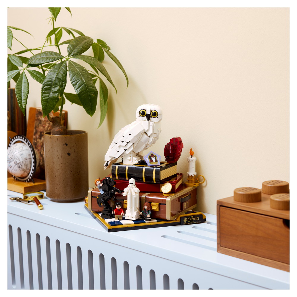 Skab den første LEGO Hedvig sneuglefigur med lukkede vinger, og udstil hende ved siden af De Vises Sten oven på Harry Potters kuffert. Tilføj 3 LEGO Harry Potter minifigurer – Harry Potter, Hermione Granger og Ron Weasley – og ting som et chokoladefrøkort og et troldmandsskakbræt.