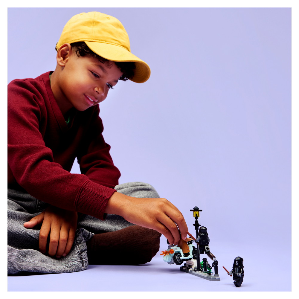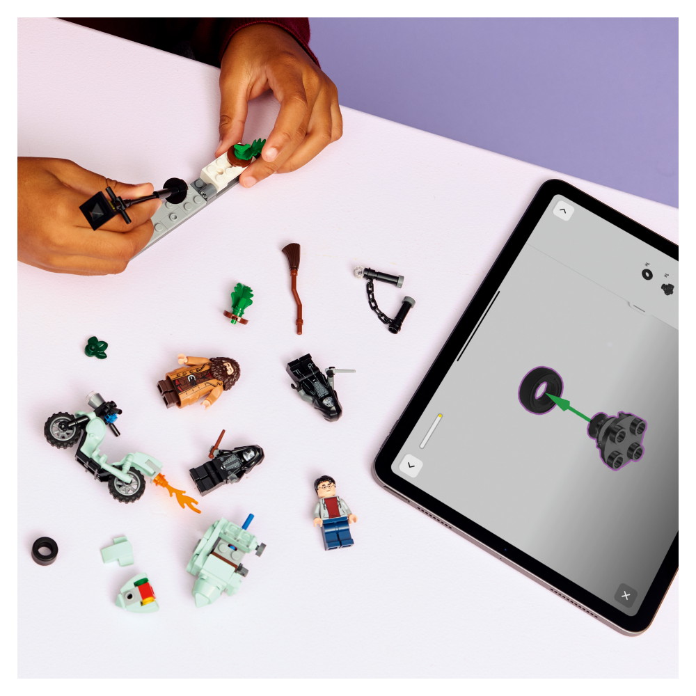 Sæt minifiguren af Rubeus Hagrid på motorcyklen og Harry Potter i sidevognen. Anbring de 2 minifigurer af dødsgardister på Ligustervænget-scenen, som har en lygtepæl og en kasse med blomsterkrukker, der er designet til at blive væltet under heltenes modige flugt.