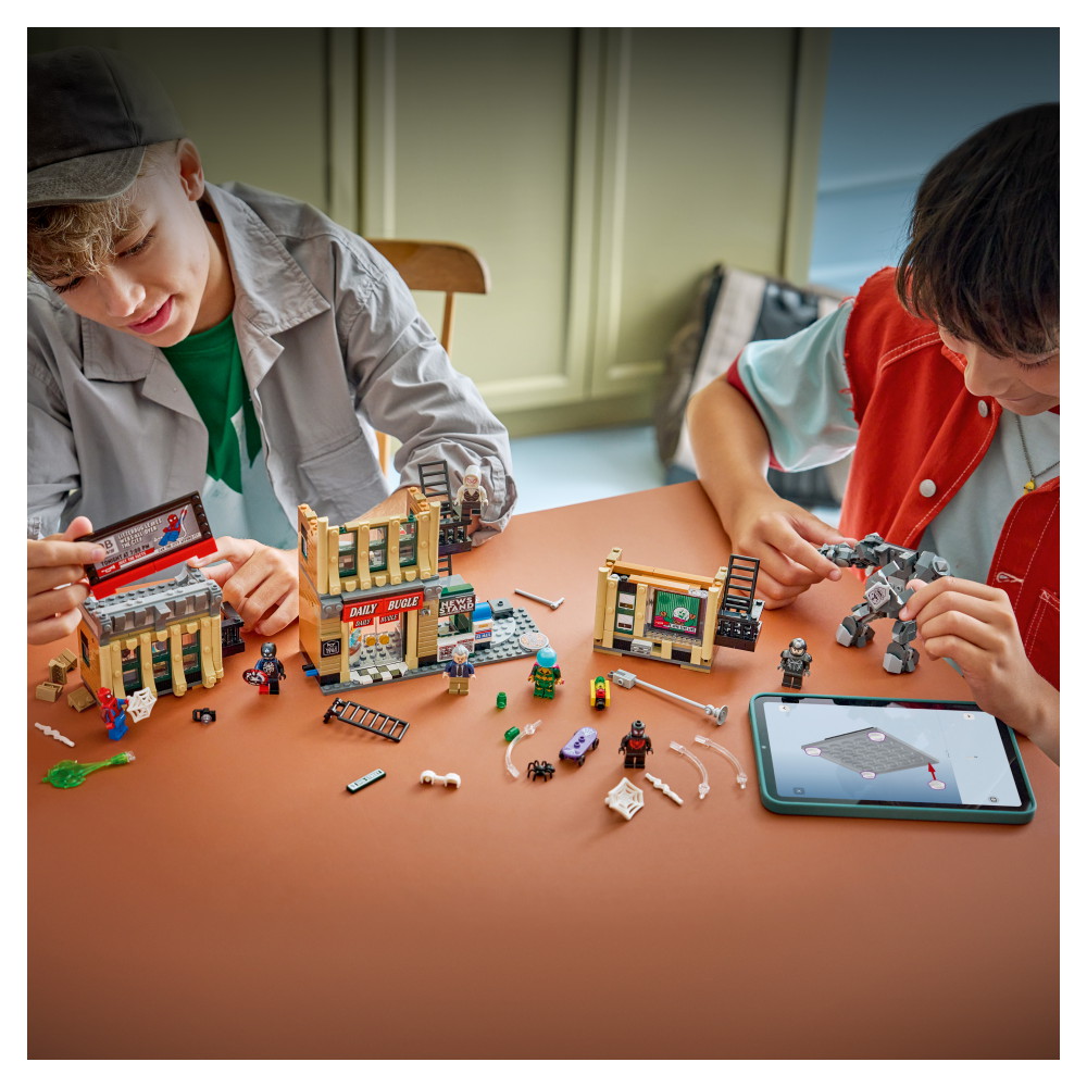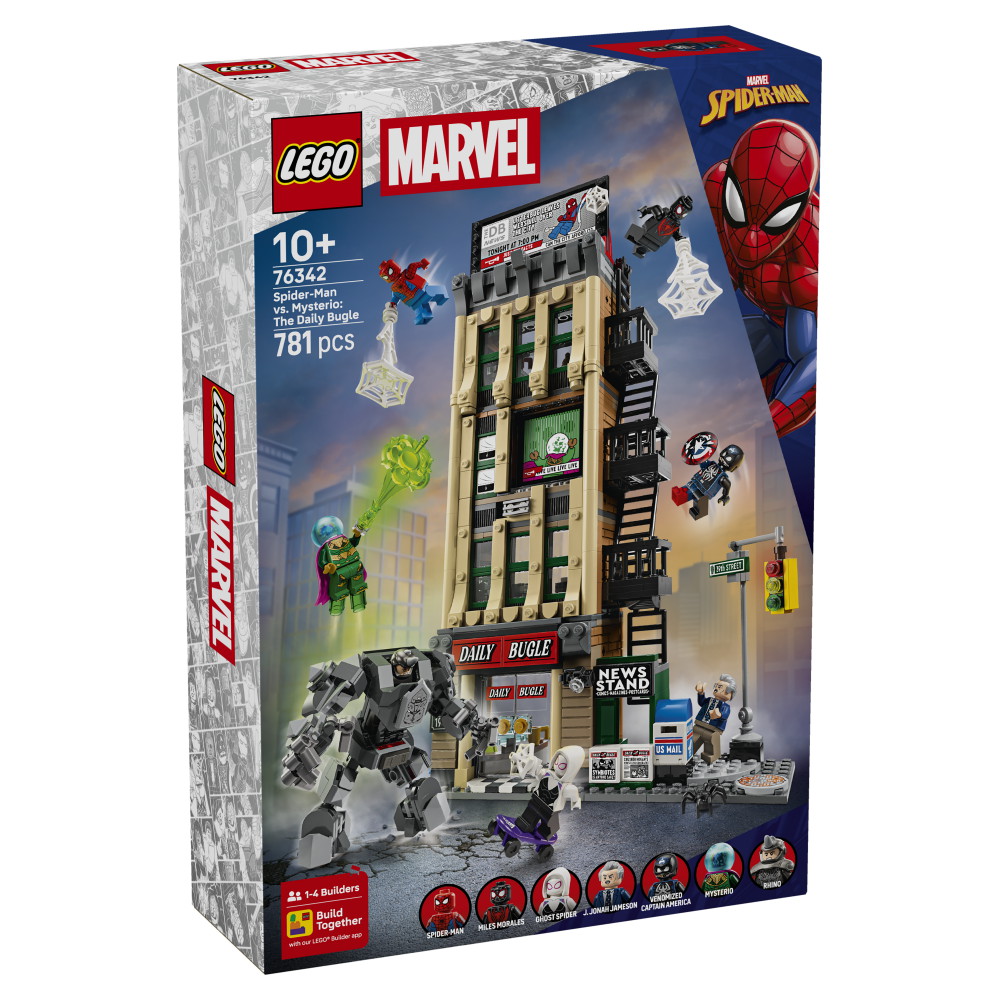 LEGO ǀ Marvel byggelegetøjet med Daily Bugle indeholder minifigurer af Spider-Man, Miles Morales, Ghost-Spider, J. Jonah Jameson, Mysterio, venomiseret Captain America og Rhino samt 3 gennemsigtige stænger og 2 gennemsigtige klodser, der giver mulighed for action i luften. Der er også en leddelt Rhino-mech med cockpit, der kan åbnes. Det detaljerede interiør omfatter kontorer, reception, teknikrum, pengeskab og et fungerende håndtag til at skifte reklameskiltet. Udenfor er der en brandtrappe, en flytbar aviskiosk og et gadehjørne med trafiklys. Download LEGO Builder appen for at få en Byg Sammen-oplevelse med venner og familie. Legesættet indeholder 781 elementer.