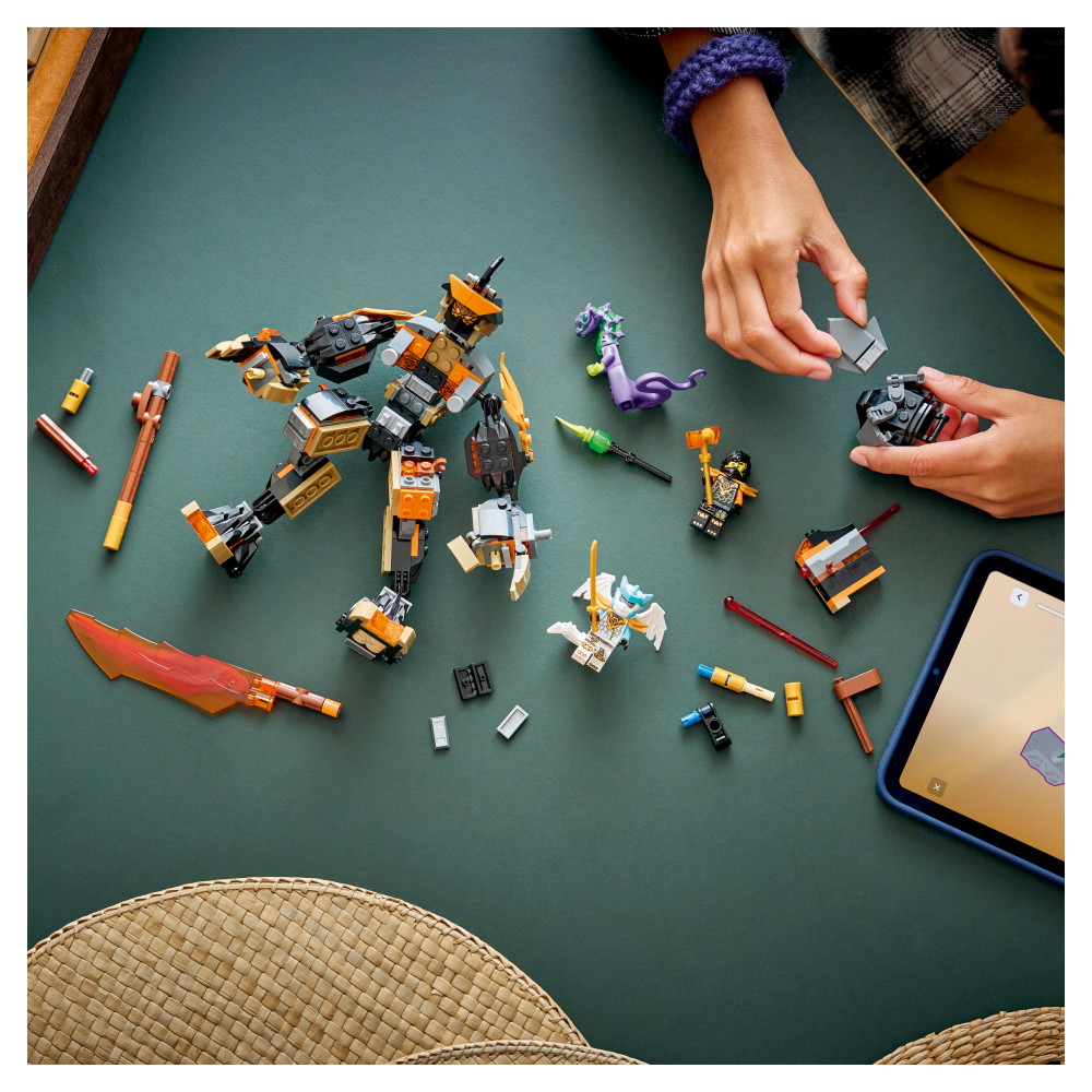 Mech'en har 3 våben, et sværd, en stav og en fjederbetjent blaster med 2 pile, som børn kan bytte ud med våben fra Ninjadragen Riyus kamp. NINJAGO-legetøjet indeholder også 3 minifigurer med tilbehør: Cole med en hammer, drage-Zane med et sværd og et syremonster med en stav til rollelegskampe.