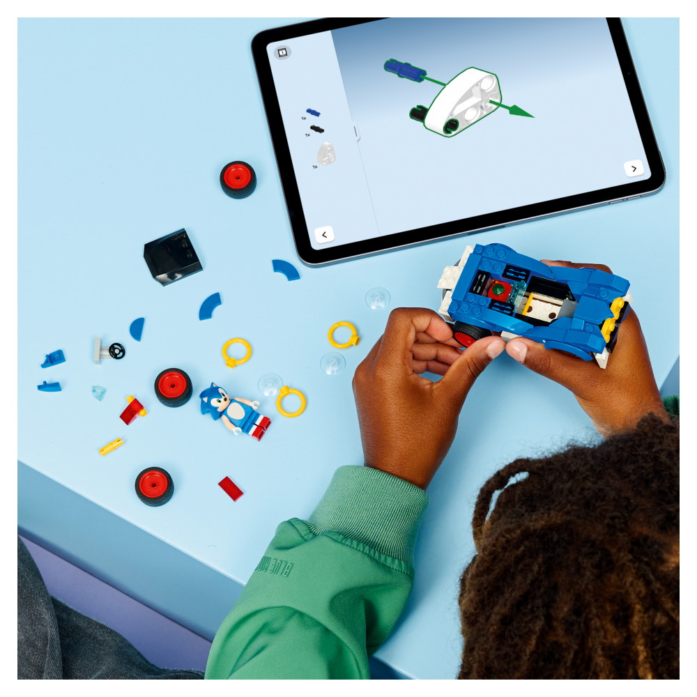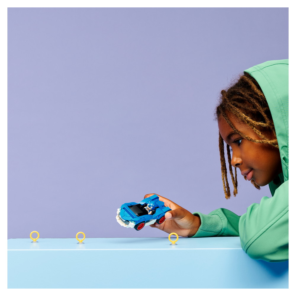 Baseret på konsolspillet Sonic Racing: CrossWorlds, så drenge, piger og gamingfans kan køre rundt med Sonic-minifiguren, der har drilsk ansigtsudtryk, og samle de 3 Guldringe. Den blå og hvide interaktive legetøjsbil i LEGO legesættet har brede dæk med røde fælge og en motorhjelm, der kan åbnes for at afsløre en skjult Chaos Emerald-smaragd.
