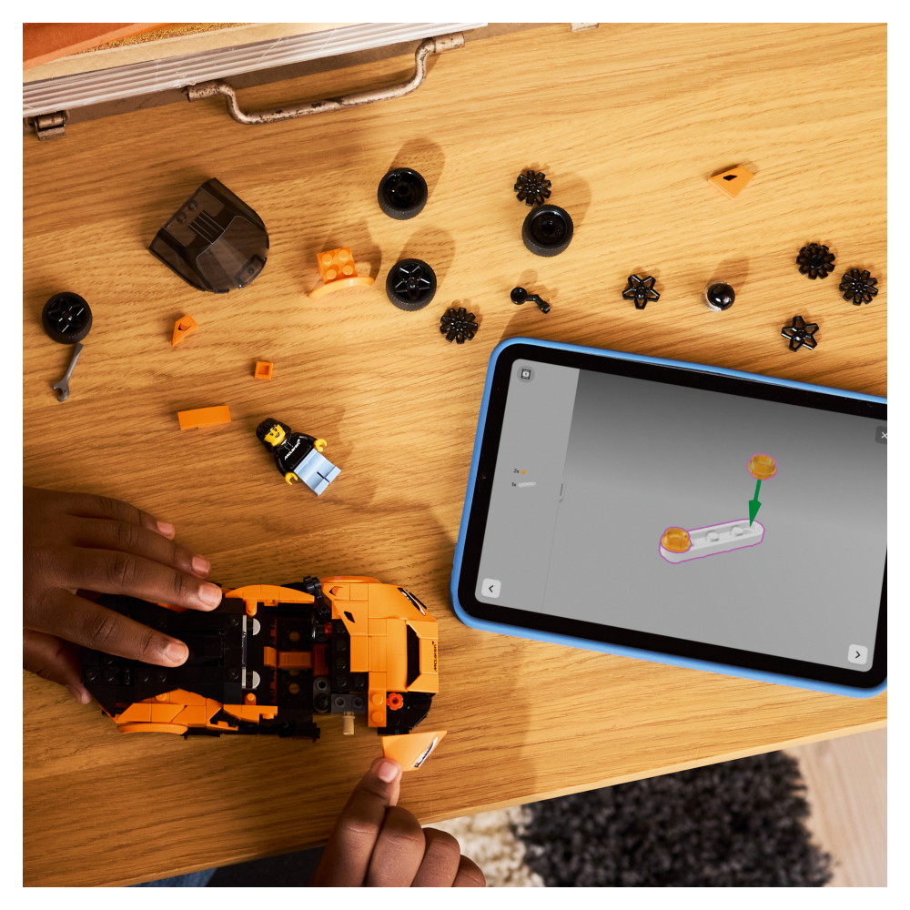 McLaren-modelbilen har en justerbar bagvinge til almindelig kørsel eller racerløb, en hækmotor, et cockpit, en infotainment-skærm og luftindtag på siderne og motorhjelmen. Racerbilen omfatter en minifigur af en racerkører i McLaren-outfit med hjelm, et hårelement og en skruenøgle til at sætte klistermærker på bilen og skille klodserne ad.