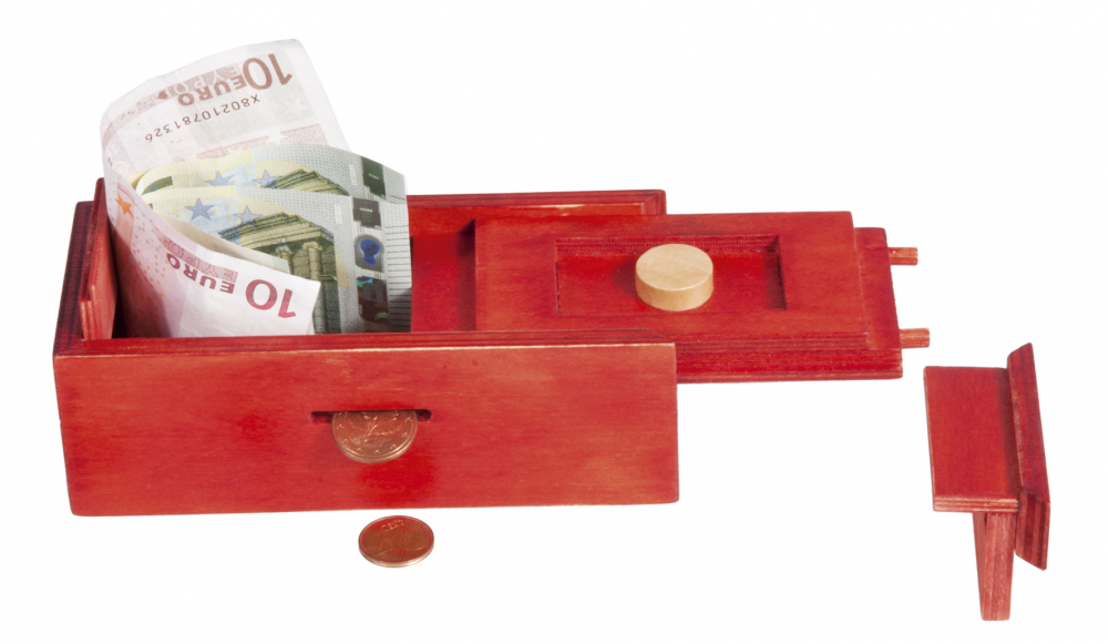 Pud mønter og pengesedler i sprækkerne. For at åbne beholderen skal du finde på løsningen. Kan bruges som gaveindpakning eller smart opbevaring til penge.