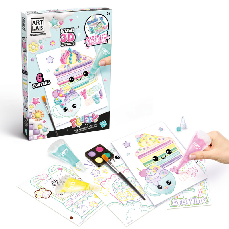 Skab fantastiske 3D-billeder med Fluffy Paint-sættet! Start med at male baggrunden, og vælg derefter dyse og farver for at skabe 3D-farveeffekter på plakaterne. Til sidst kan du dekorere med sjove dekorationer og gøre dit kunstværk endnu mere spændende. Alt hvad du behøver for at lave 6 plakater er inkluderet i sættet.