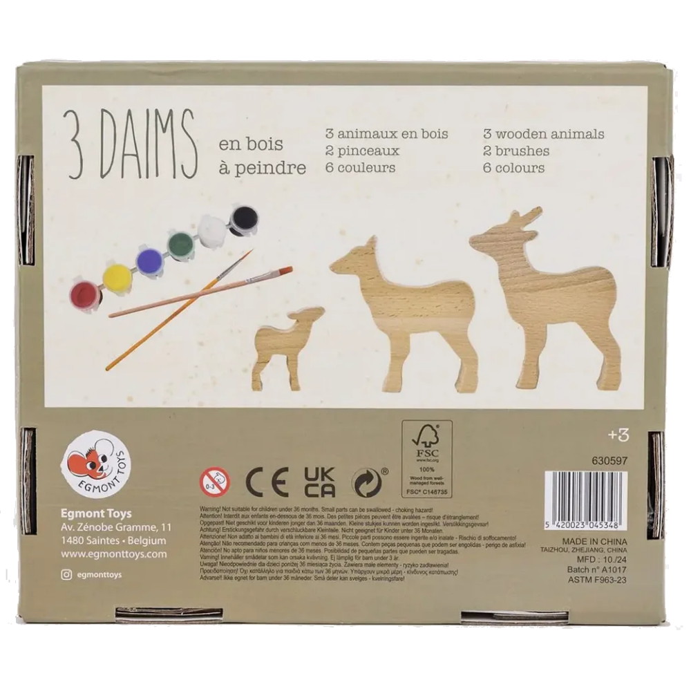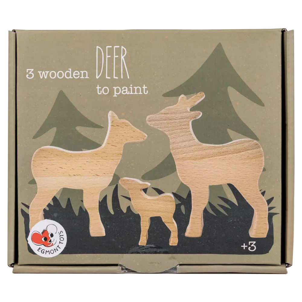 Tre glatte træhjorte venter stille på, at små hænder vækker dem til live med farver.