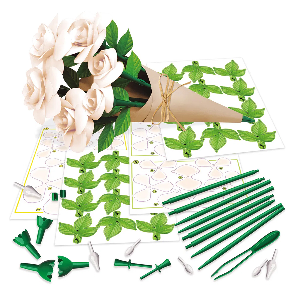 Floral Art-sættet indeholder alt, hvad du skal bruge til at lave en buket med 6 hvide papirroser.