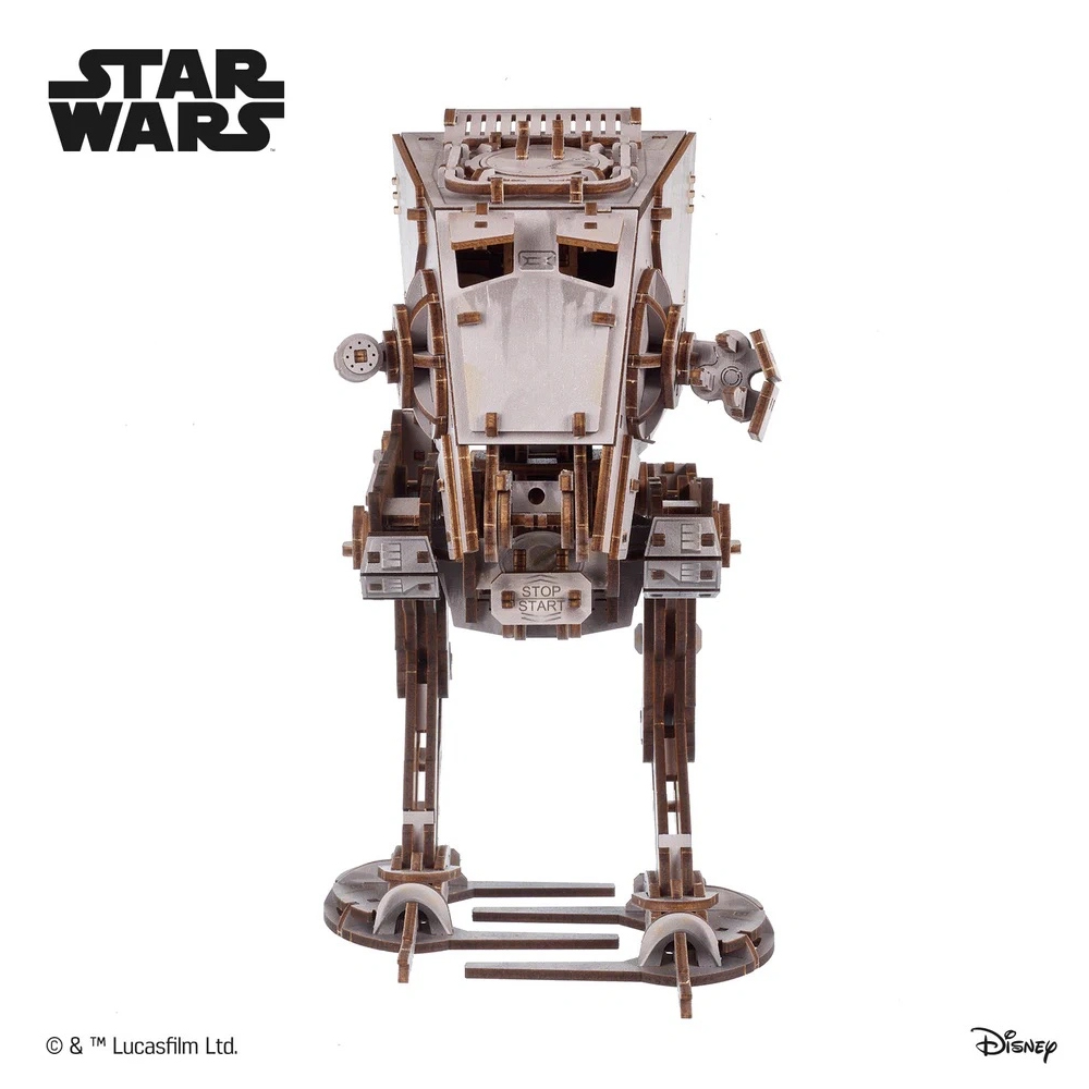 Den tobenede All Terrain Scout Transport – Star Wars AT-ST – fra den licenserede Ugears-serie er et fjederdrevet tobenet let patruljekøretøj fra det Galaktiske Imperiums frygtindgydende arsenal. Fans af Star Wars-sagaen vil genkende disse infanterikrigsmaskiner fra slagene på Hoth og Endor, som set i The Empire Strikes Back (1980) og Return of the Jedi (1983). Pas på Ewok-fælder og stampende træstammer!