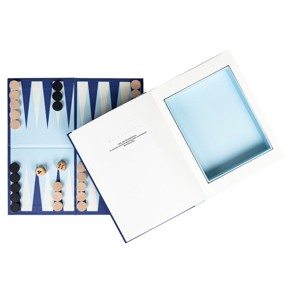 Inde i den bogformede æske gemmer sig et komplet backgammon-sæt med spilleplade, brikker og terninger. Designet er både praktisk og dekorativt, hvilket gør spillet lige så flot at have stående i bogreolen som at bruge i hverdagen.