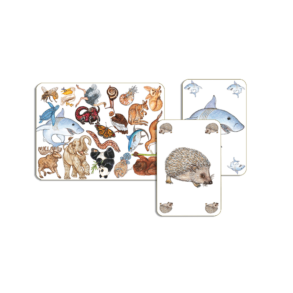 Spillet indeholder 72 kort (12 store kort med blandede dyr og 60 dyrekort)