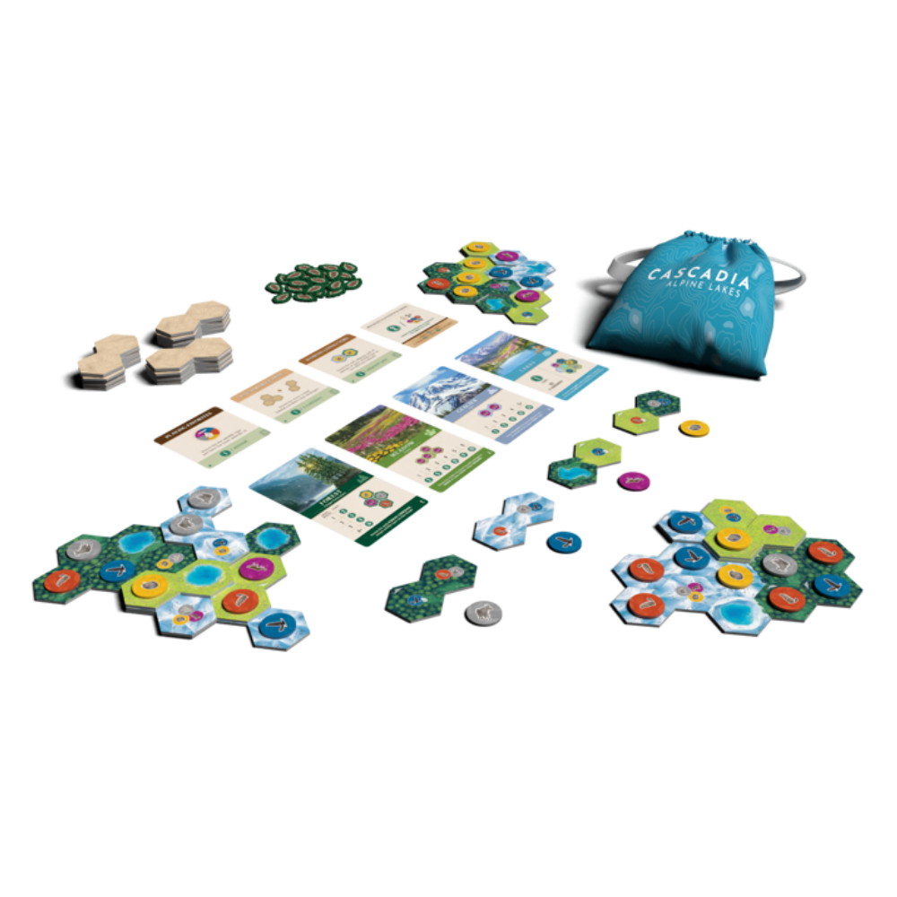 Cascadia: Alpine Lakes udvider det klassiske gameplay med tredimensionelle elementer. Du placerer dobbelte hex-brikker og stabler dem for at skabe et levende landskab. Placeringen af dyreliv og højdeforskelle spiller en central rolle i din strategi.