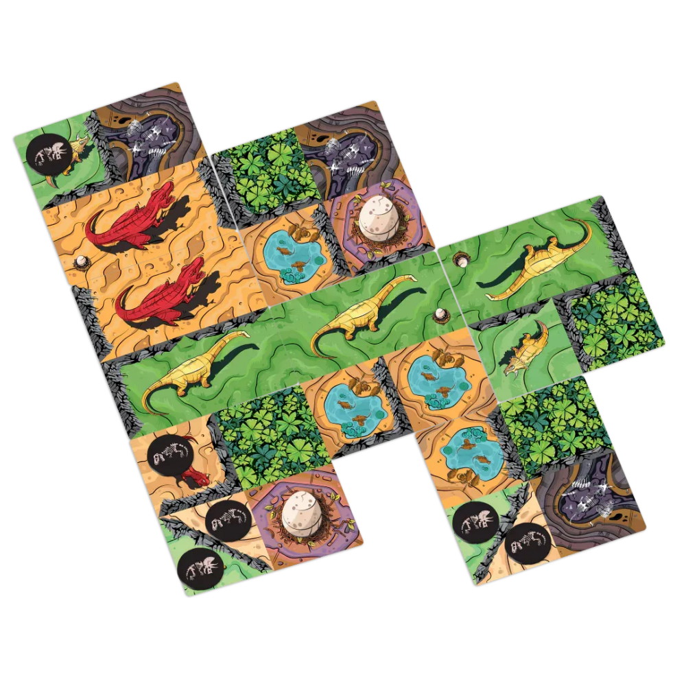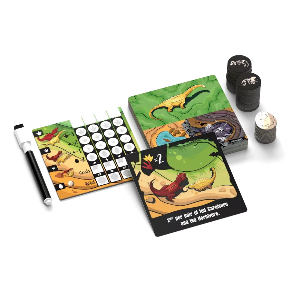 Hver runde kan du vælge mellem rækker med 3 målkort og 3 dinosaurkort. Hvis du tager et mål, vil det hjælpe med at styre din strategi for at score point i slutningen af spillet. Hvis du tager en dinosaur, skal du tilføje den til dit dinosaurland. Når du tilføjer kort, vil du forsøge at danne flokke, sørge for, at de alle bliver fodret, og maksimere din pointgivning!