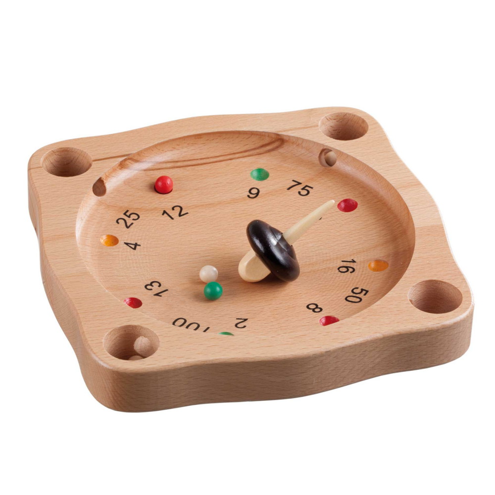 Tiroler Roulette er et spil, der består af en snurretop, som rammer kuglerne tilfældigt og får dem til at lande i huller, der består af forskellige punkter.Målet er at være den første, der når den aftalte score, som spillerne blev enige om i starten af spillet.Materiale: Hevea-træFarve: LysebrunSpillets størrelse: 215 x 215 x 35 mm