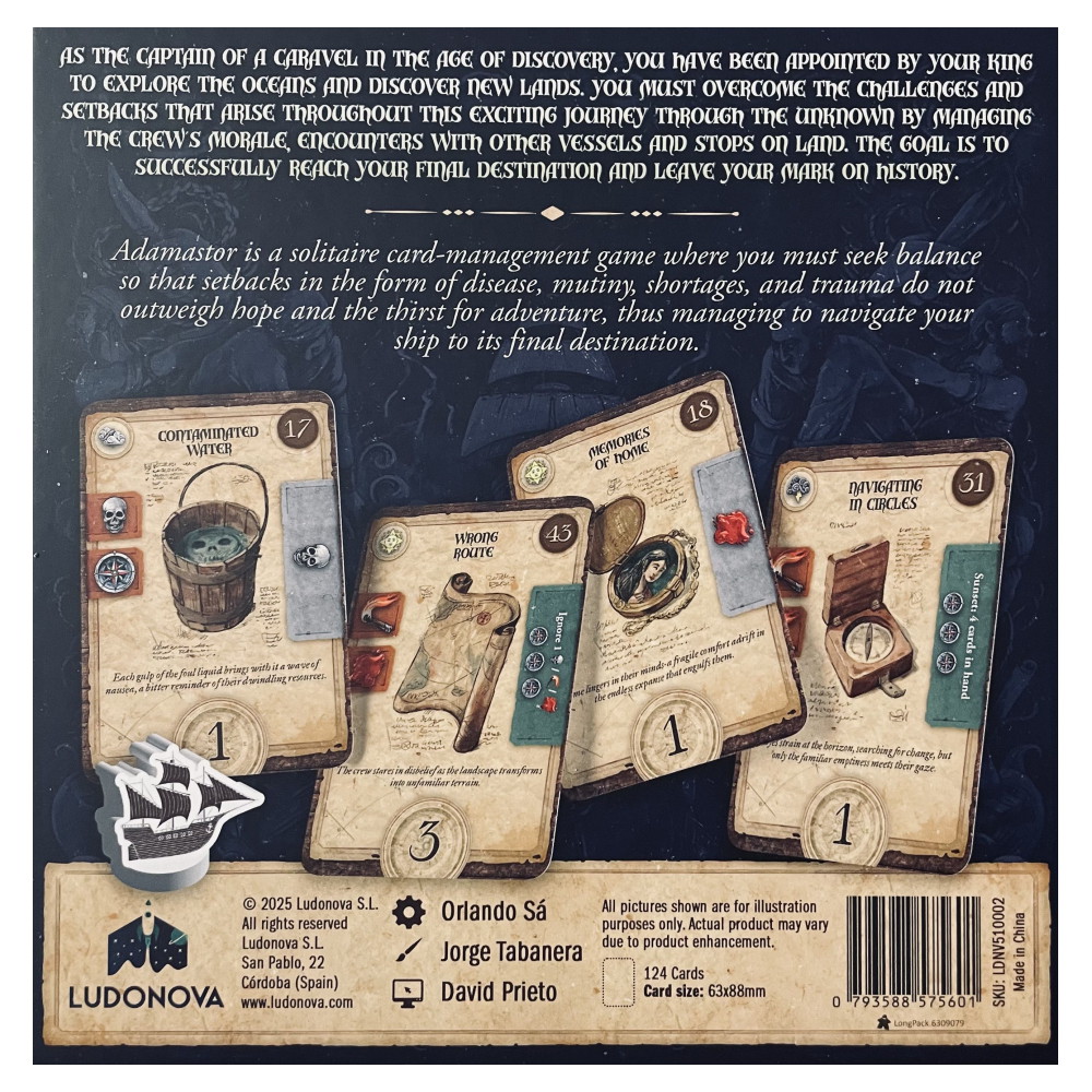 Adamastor er et strategisk kort- og tableau-spil med multi-use kort, hvor du konstant må balancere ressourcer, moral og risici. Begivenheder udløses af dine valg, og uforudsigelige udfordringer som storme og modgang sætter dit lederskab på prøve.