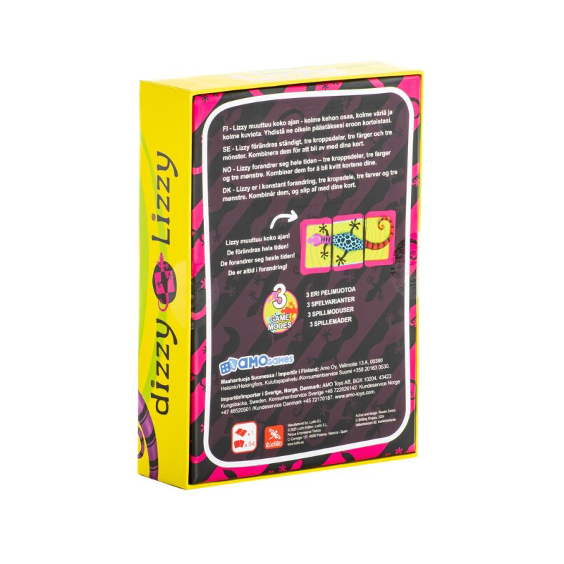 Dette er en strategisk og turbaseret konkurrence om at være den første til at slippe af med alle dine kort! Test dine evner i Dizzy Lizzy ved at matche tre kropsdele, tre farver og tre mønstre. Kortspillet, der fortsætter med at være sjovt! Spillet kan spilles på 3 forskellige måder. Spillet varer cirka 10 minutter pr. runde.