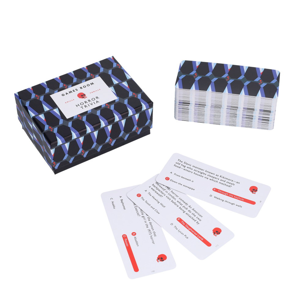 En iøjnefaldende bærbar boks indeholder 140 multiple choice-spørgsmål om en række uhyggelige emner hentet fra gyserfilm, litteratur, tv-serier, hjemsøgte steder, paranormale fænomener, berømte monstre og meget mere.Trivia Game Horror (ENG)
