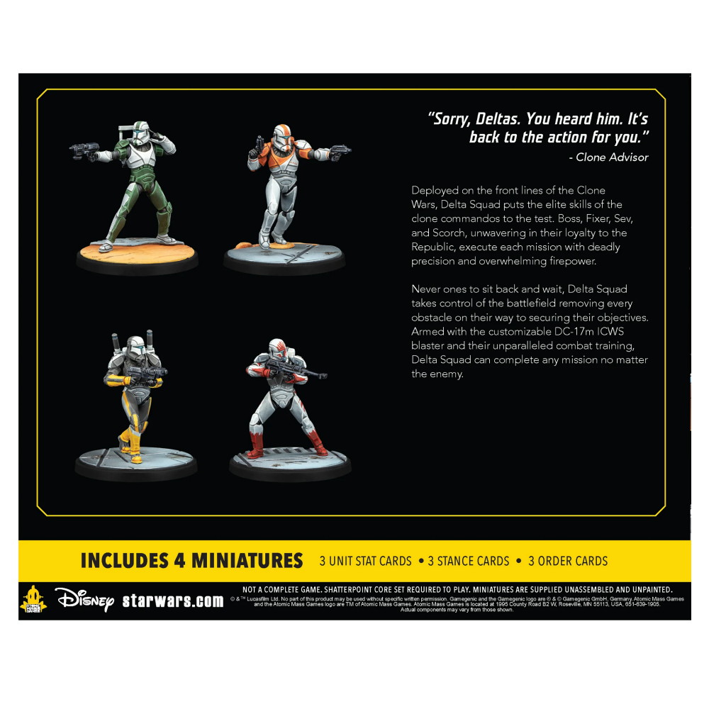 Delta Squad, Form Up Squad Pack giver spillerne 4 fanfavoritter fra Republikken, som de kan indsætte i deres Star Wars: Shatterpoint-spil. Scorch og Sev leverer unikke områdekontrolevner, der giver dem mulighed for at målrette flere enheder og kontrollere slagmarken, mens Boss og Fixer leverer taktikker til holdet og kan manipulere mål.