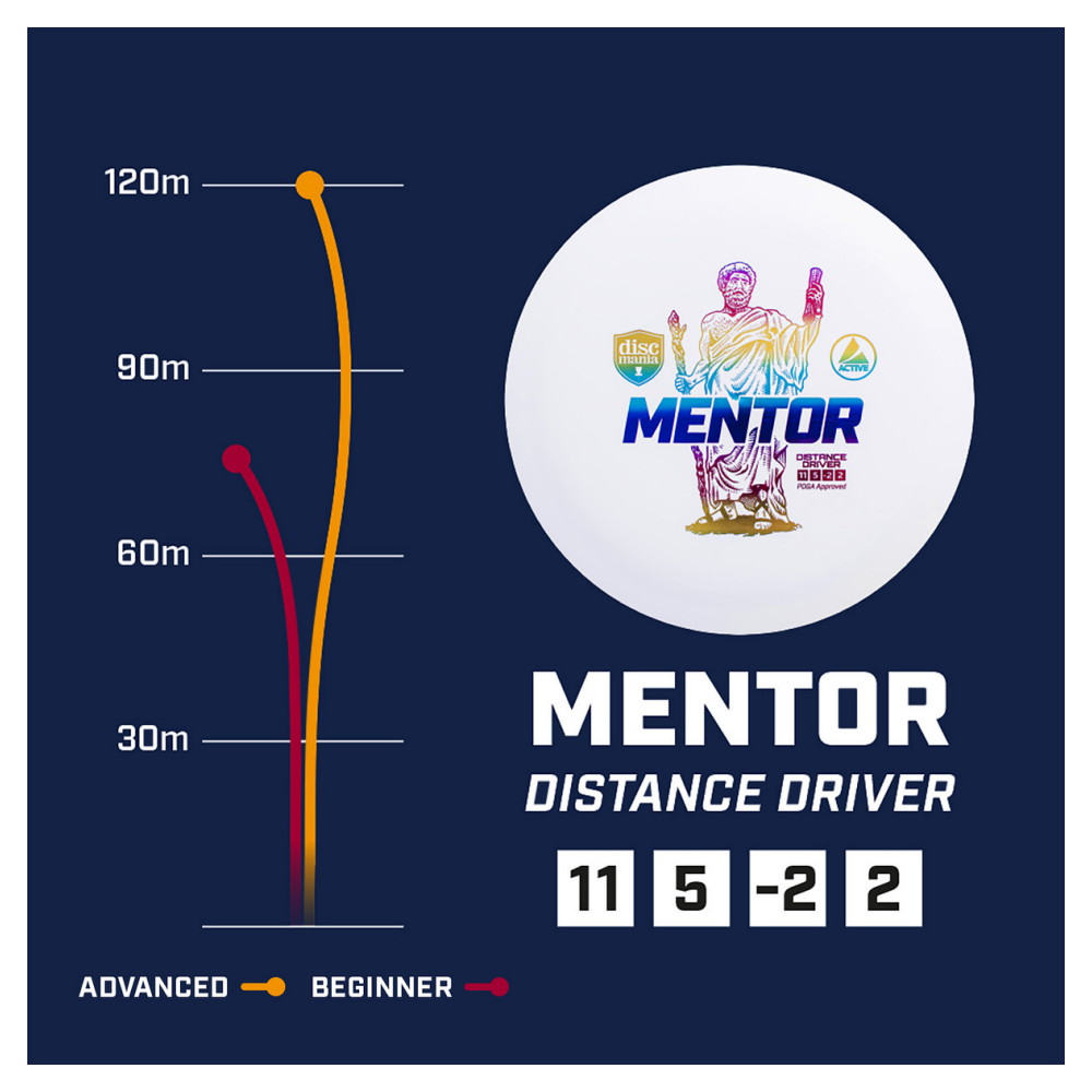 Mentor er en distance driver designet til at give maksimal længde i dine kast. Ved at kombinere tydelig high-speed turn med stabilitet i slutningen af flyveturen får du en disc, der både kan flyve langt og afslutte kontrolleret. Det gør Mentor velegnet til spillere på alle niveauer.