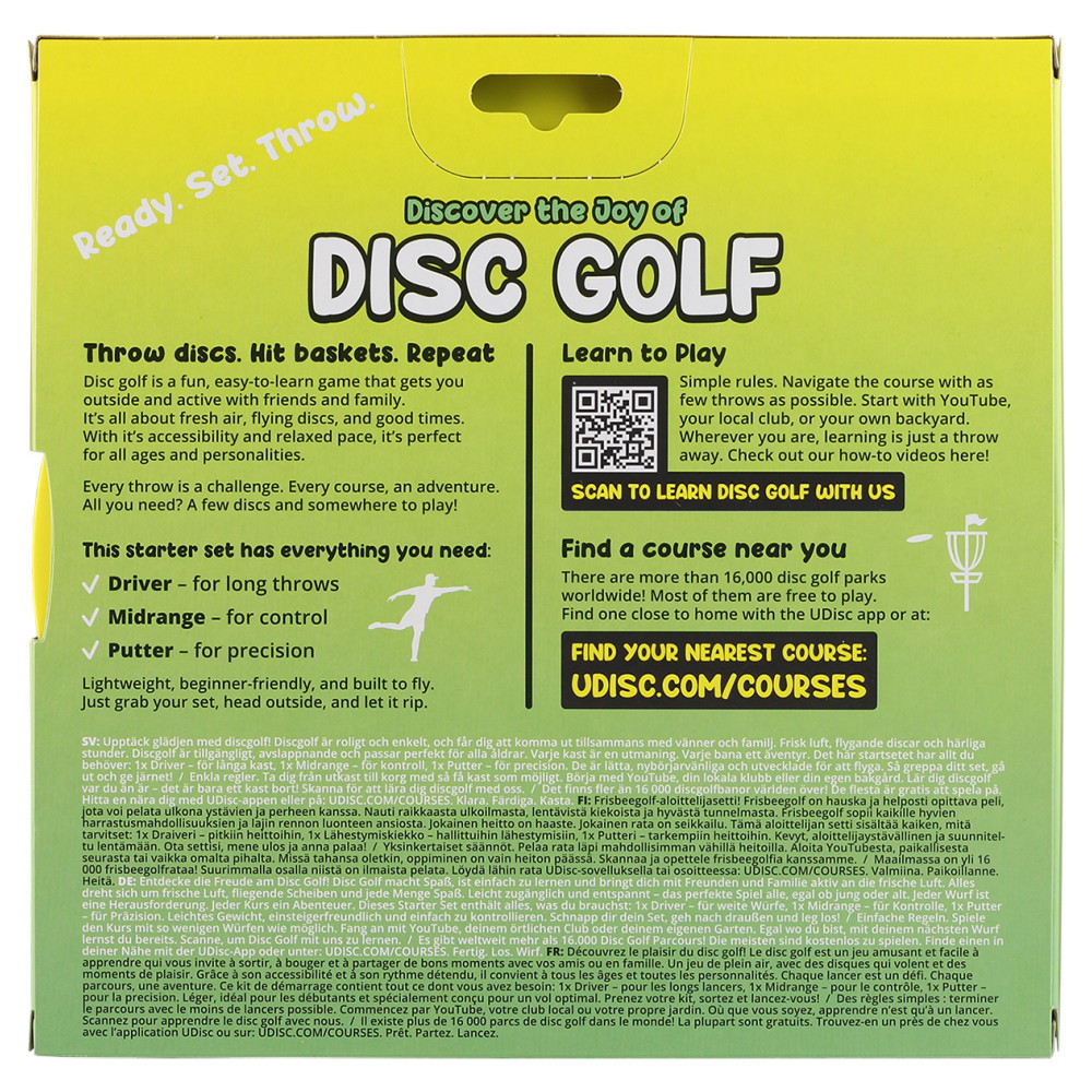 Discsene er lette, begyndervenlige og designet til at flyve godt. Tag dit sæt, gå udenfor og kast løs!